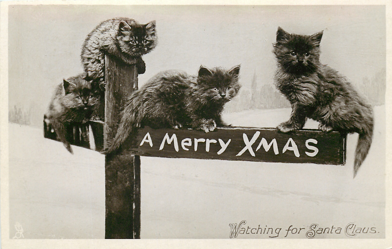 A MERRY CHRISTMAS WATCHING FOR SANTA CLAUS four kittens perched on sign post showing