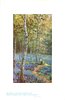 person on path bends to pick bluebells, many silver birch over bluebells