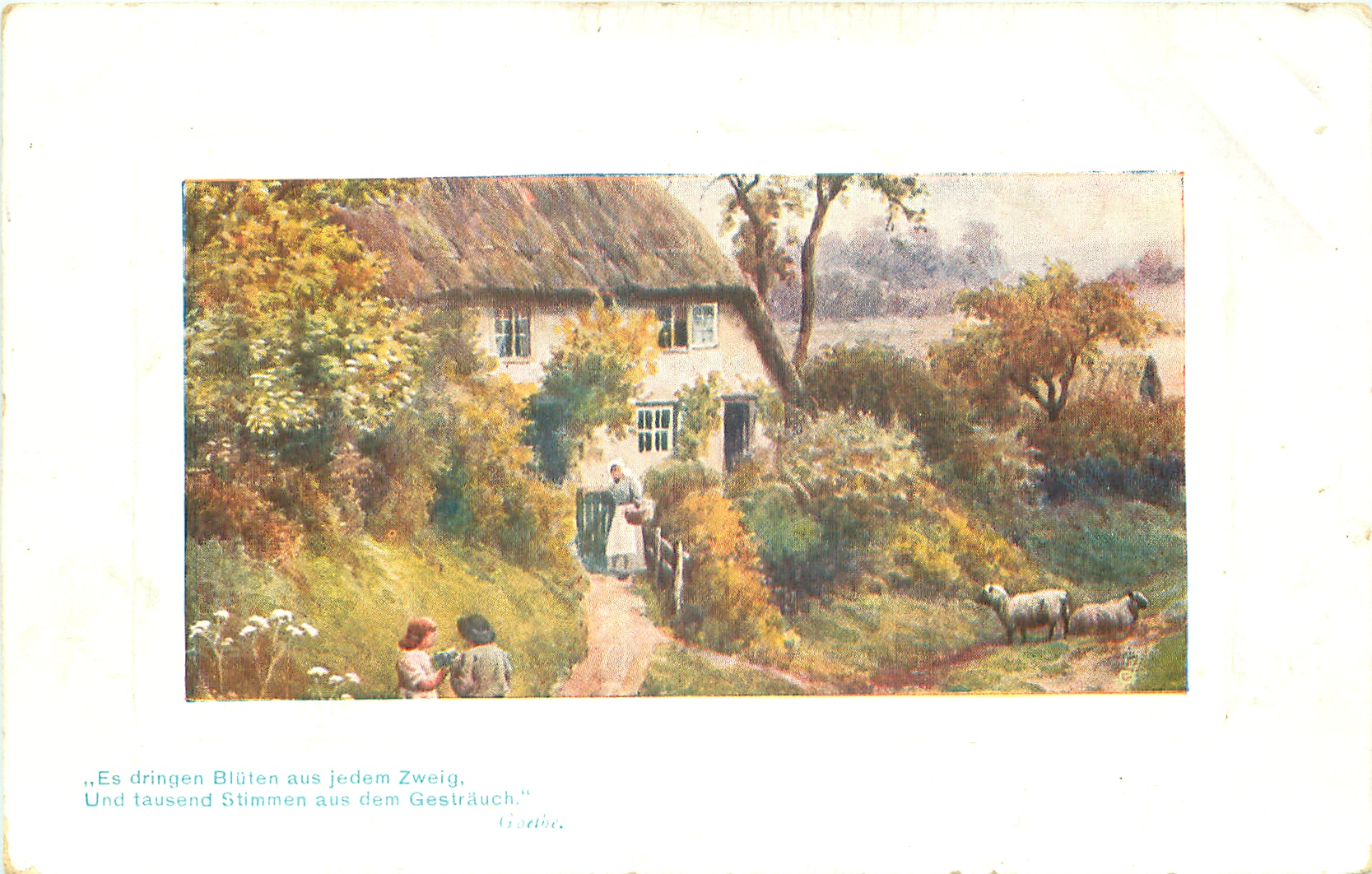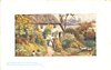 woman at thatched cottage gate, two sheep in lane, two people front left