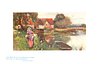 girl picking white flowers on river bank left, punt front right, buildings & tree behind left