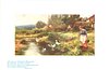 girl on right bank of stream, five ducks, footbridge back, buildings & trees back right