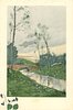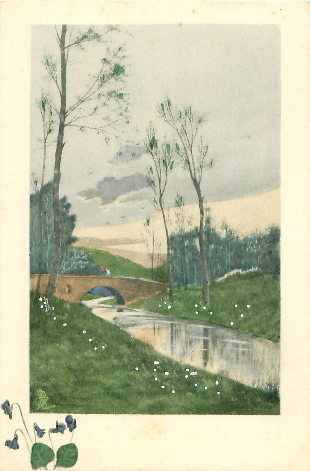large inset, violets lower left margin, stream running from back left to front right, bridge back