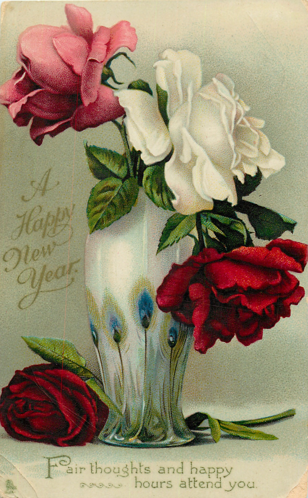 A HAPPY NEW YEAR red white & pink roses, green & white vase