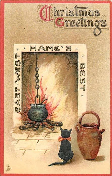 CHRISTMAS GREETINGS cat sits looking at cauldron cooking on fire