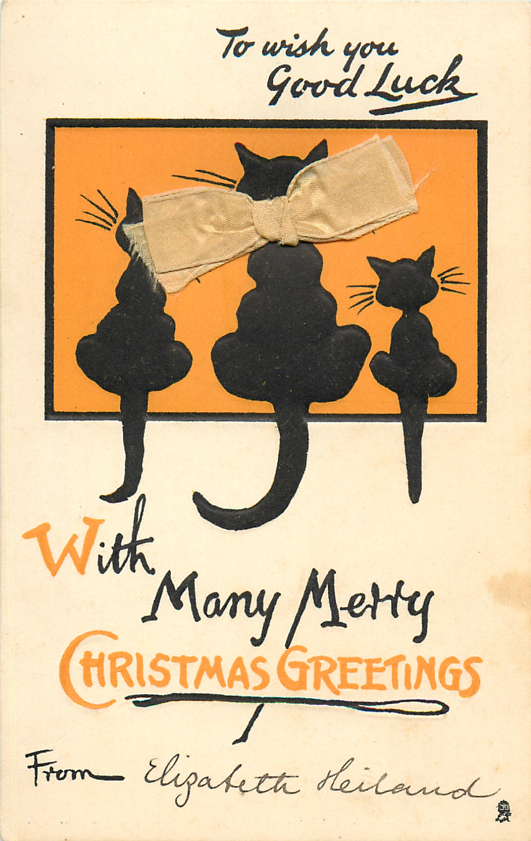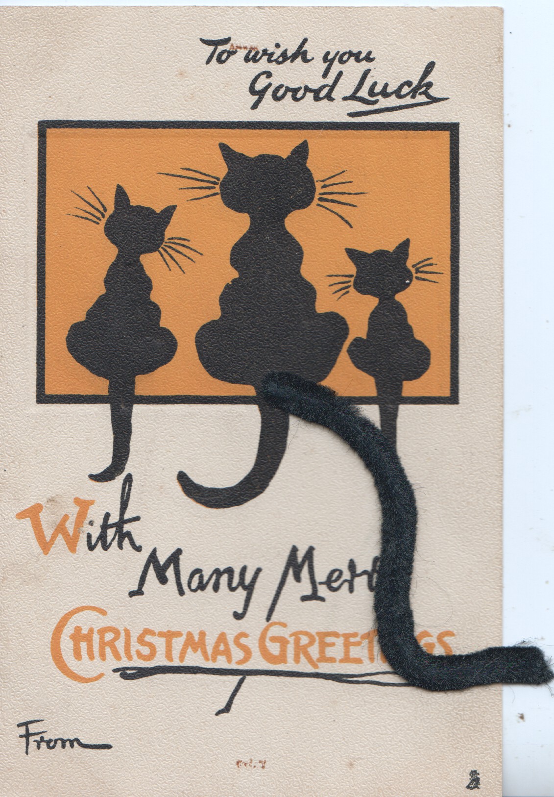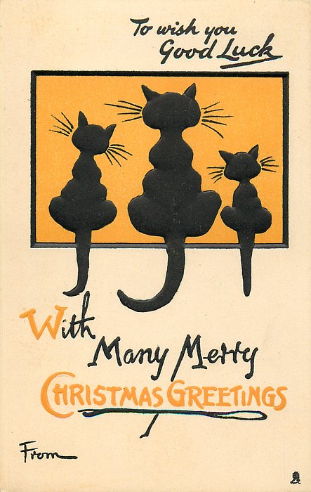 WITH MANY MERRY CHRISTMAS GREETINGS 3 black cats, orange background