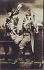 2 children in old style dress sit facing one another on stone parapet
