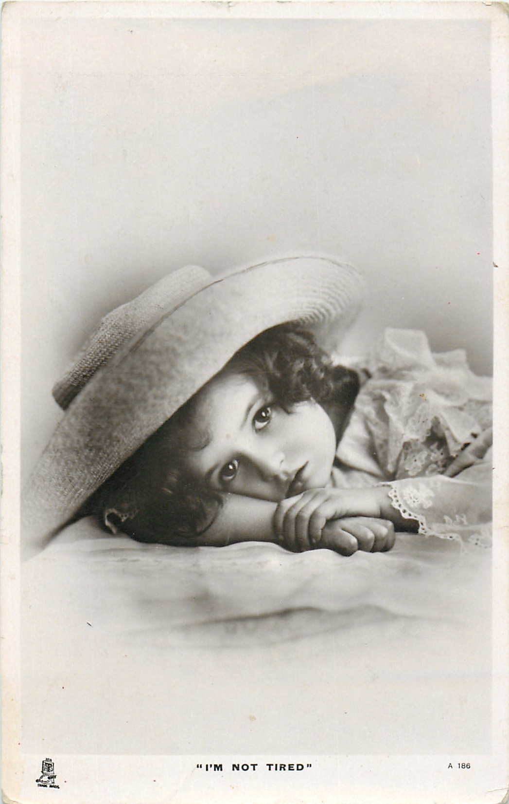 "I'M NOT TIRED" girl in large hat lies prone, faces front