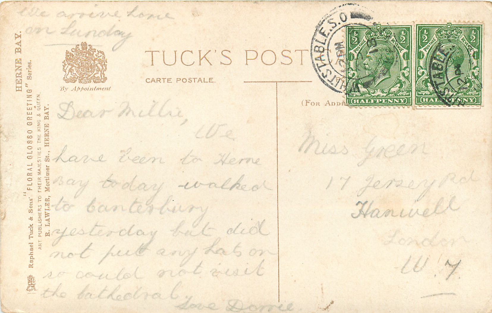 FLORAL GLOSSO GREETING, R. LAWLER, MORTIMER ST., HERNE BAY.