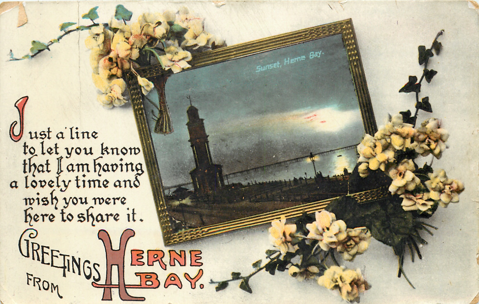 GREETINGS FROM HERNE BAY, inset SUNSET, HERNE BAY, ivy & yellow flowers, JUST A LINE TO LET YOU KNOW//SHARE IT