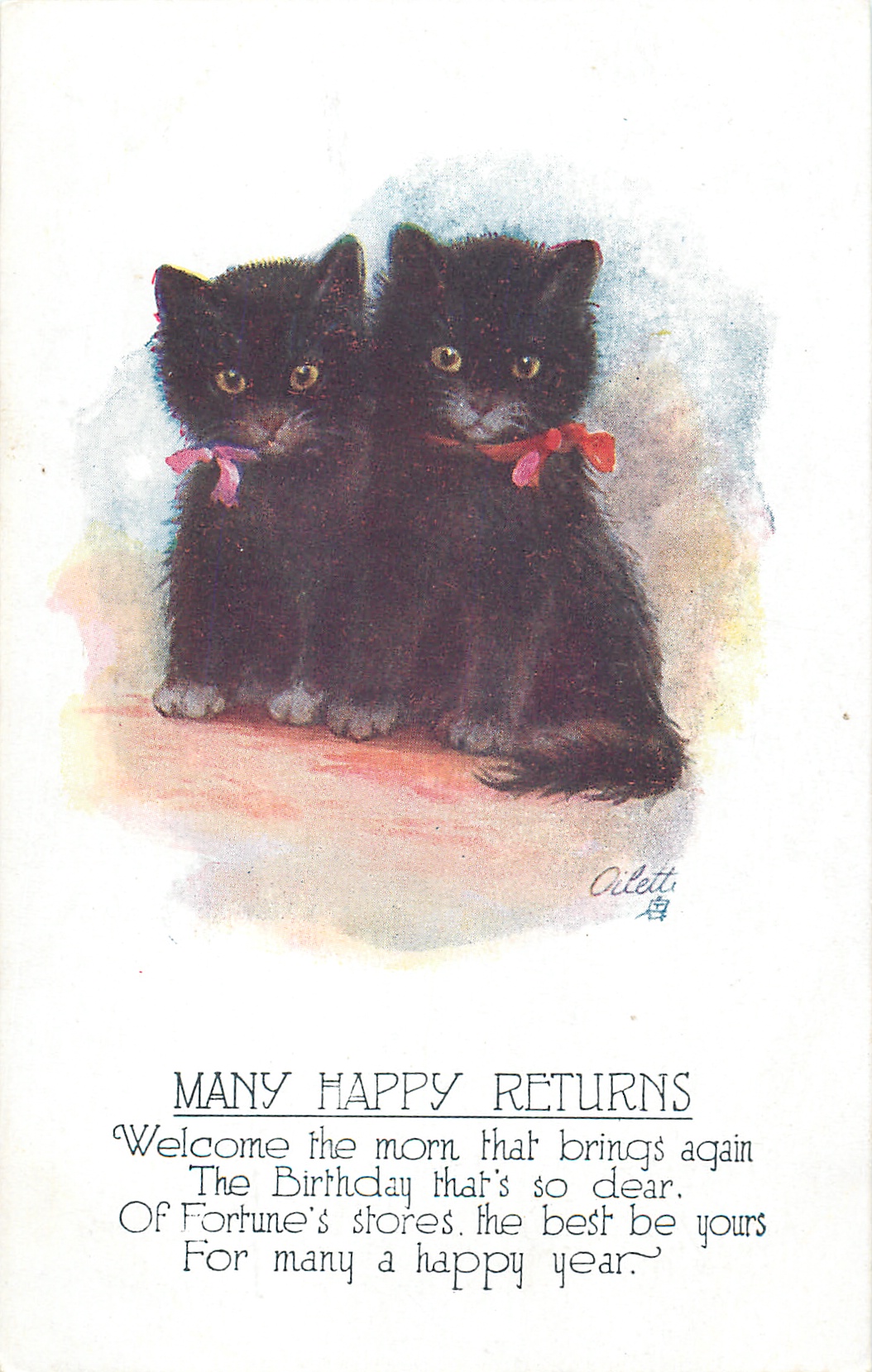 verse:- WELCOME THE MORN THAT BRINGS AGAIN THE BIRTHDAY THAT'S SO DEAR, OF FORTUNE'S STORES//YEAR., same image IN KITTENDOM 3291