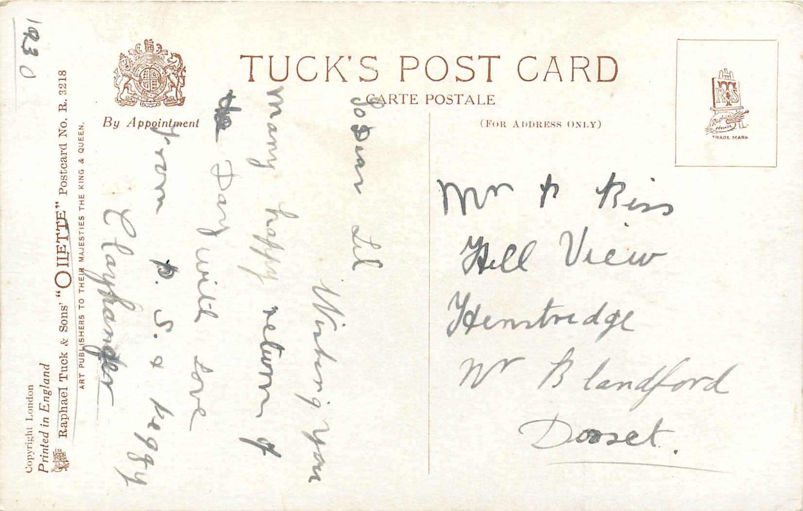 verse:- JUST A CARD IN GLAD REMEMBRANCE SPED TO-DAY WITH WISHES KIND THAT THE SUN SHINE BRIGHT//BEHIND.