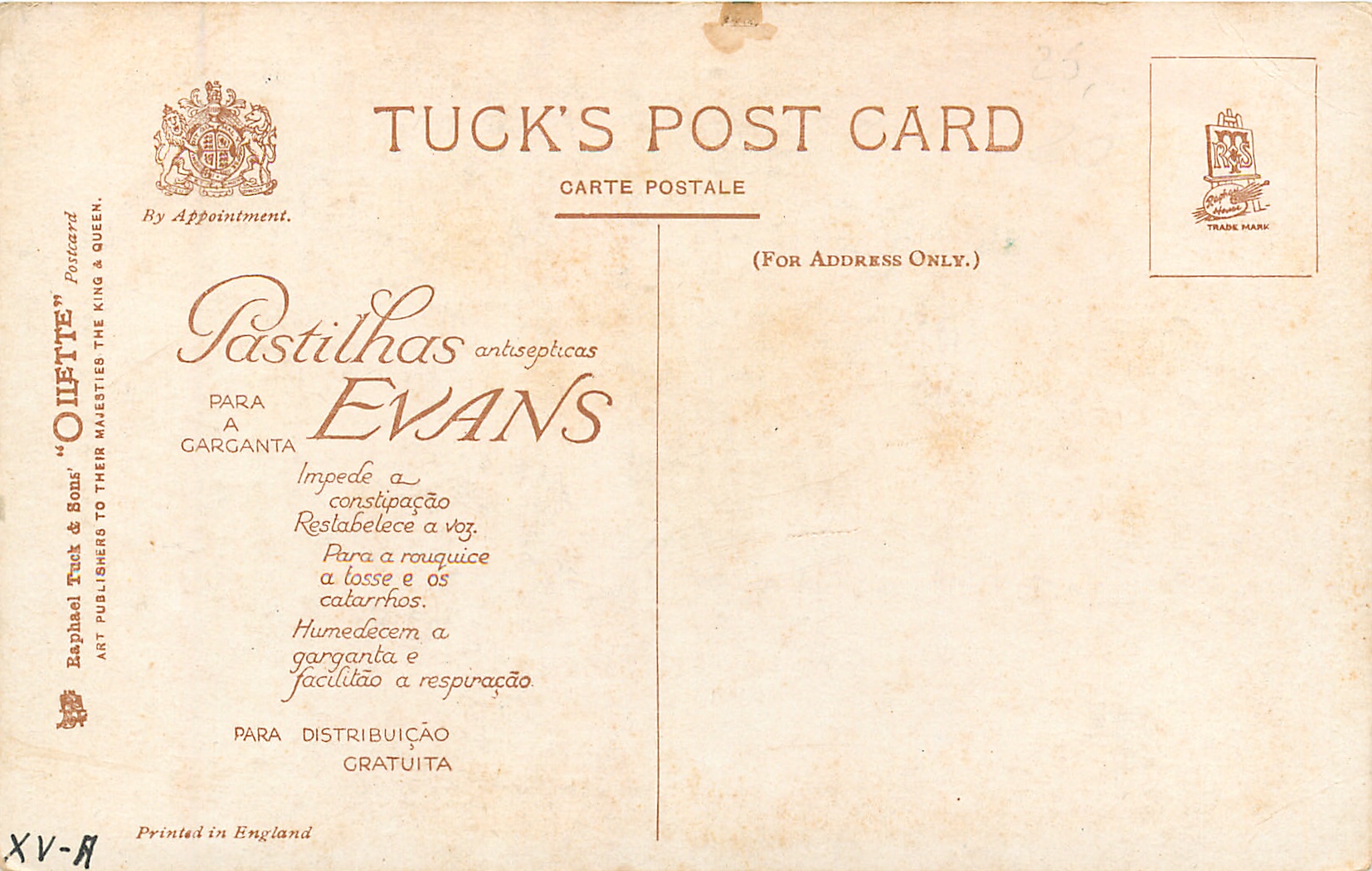 OILETTE PRINTED IN ENGLAND, Tuck information in English, message in Spanish