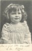 3/4 study of girl facing front, looking up & slightly right wearing two ribbons in hair