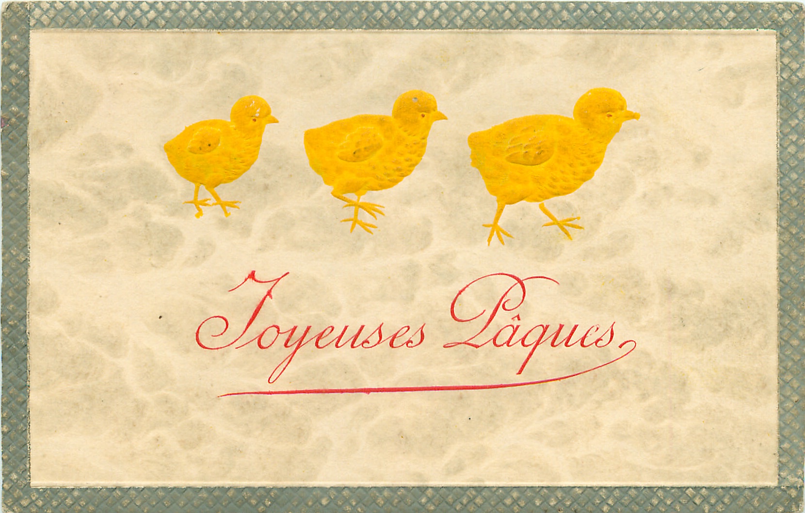 JOYEUSES PAQUES Easter chicks on grey cross-hatch bordered & marbled cards