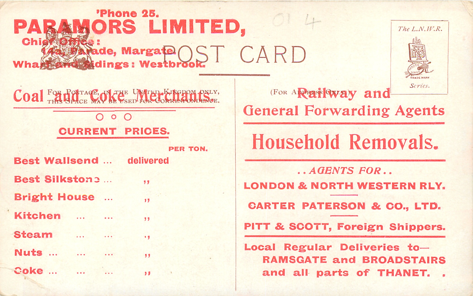 same titles, slightly different image in grey set used for advertising, see scan:- opt. in red on back PARAMORS LIMITED, COAL AND COKE MERCHANTS, MARGATE