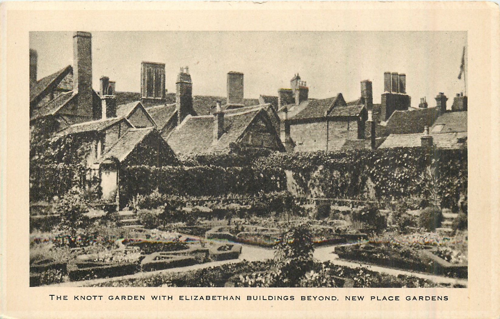 THE KNOTT GARDENS WITH ELIZABETHAN BUILDINGS BEYOND. NEW PLACE GARDENS