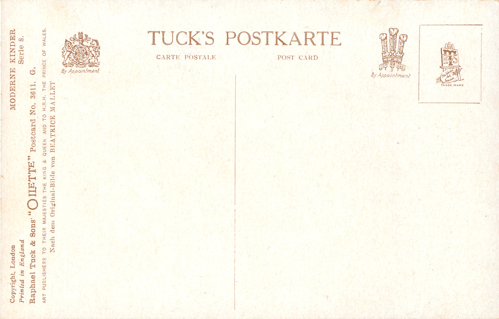 OILETTE, PRINTED IN ENGLAND, COPYRIGHT LONDON, NACH DEM ORIGINAL-BILDE VON BEATRICE MALLET, G for German language, same image & number English back CUTE KIDDIES