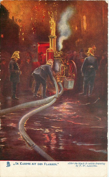 IM KAMPFE DEN FLAMMEN' the brigade at work connecting the hose