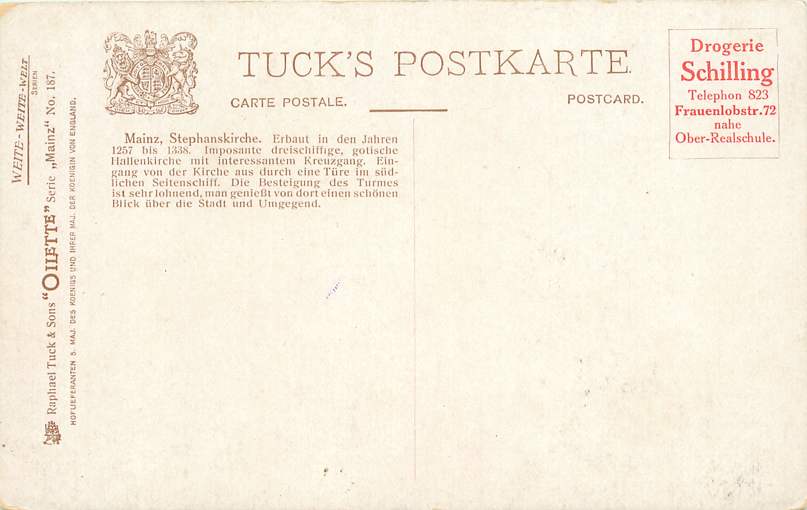 OILETTE KOLLEKTION DEUTSCHER STADTE or OILETTE, WEITE-WEITE-WELT, suffix B, come with red ad. in stamp box DROGERIE SCHILLING TELEPHON 823 FRAUENLOBSTR. 72 NAHE OBER-REALSCHULE