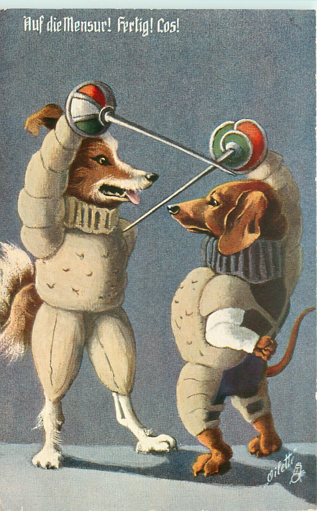AUF DIE MENSUR! FERLIG! COS! dressed dachshund & terrier dressed in armour fence with swords