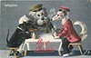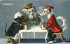 COLLOQUIUM dressed dachshund, terrier & greyhound seated at table, smoking & drinking
