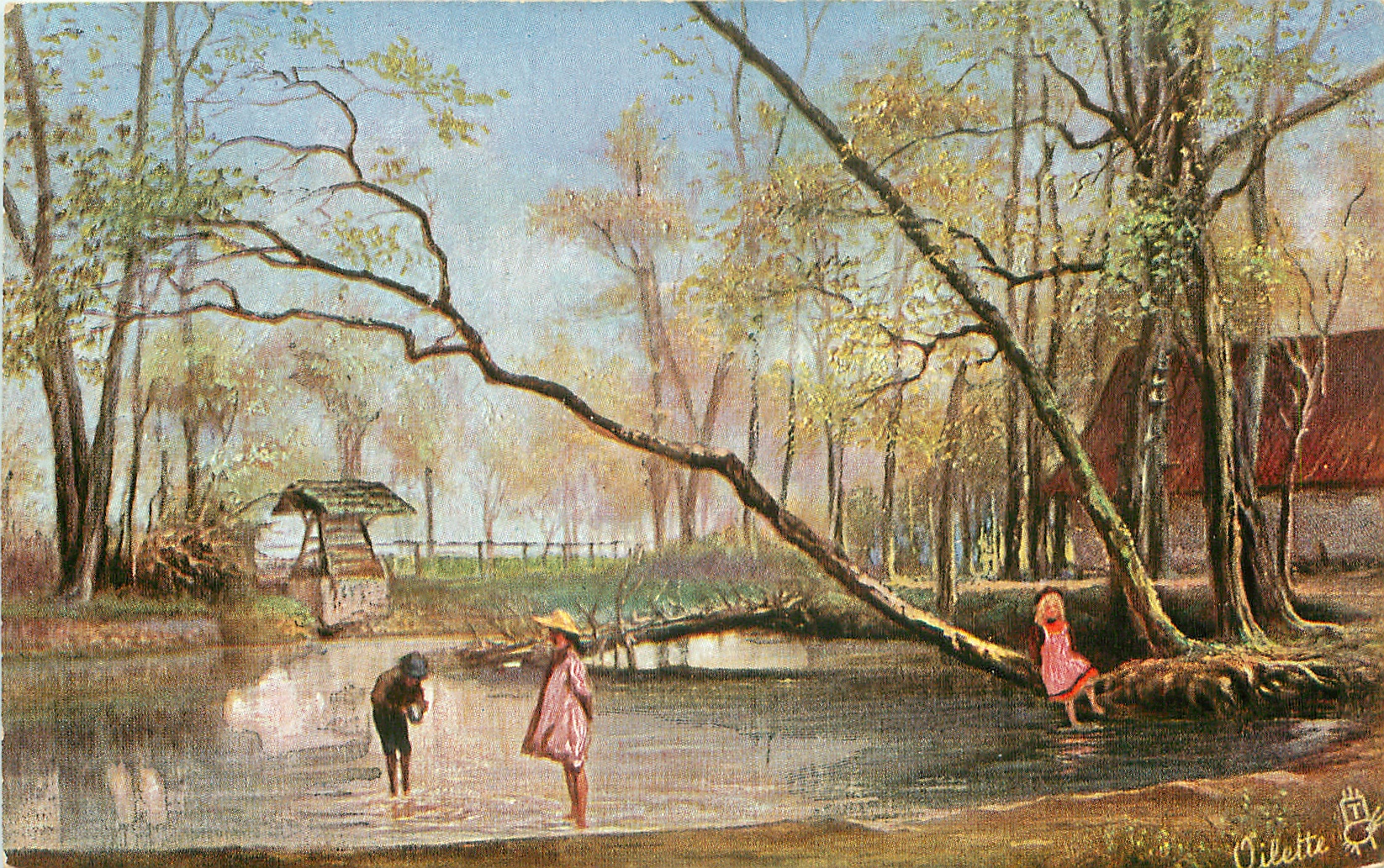 two children paddle in pond, another sits on tree dangling feet in the water, trees behind