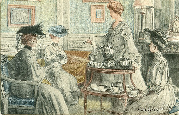 FIVE O'CLOCK TEA woman stands behind table with tea service on it, 3 others sit holding tea cups
