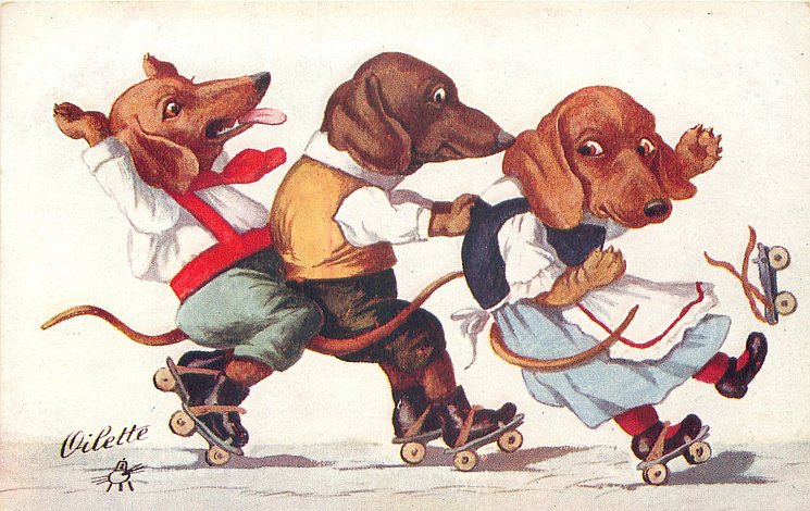 three dressed dachshund children roller-skate right, leading girl looses skate, all begin to fall back