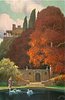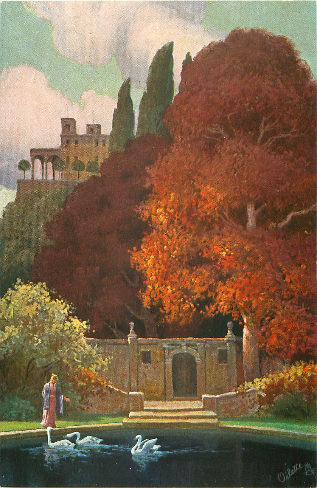 lady feeds three swans on pond in foreground, gate in wall behind, large sunlit tree right, villa upper left