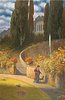 lady & dog on path between lawn & wall, long flight of steps between trees, leading up to temple