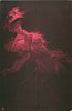 pretty girl in elegant hat, muff & flowing dress, sits with hand on chin, facing right, looking front