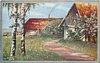 two silver birch front left,, lilac right, buildings back behind & right of well