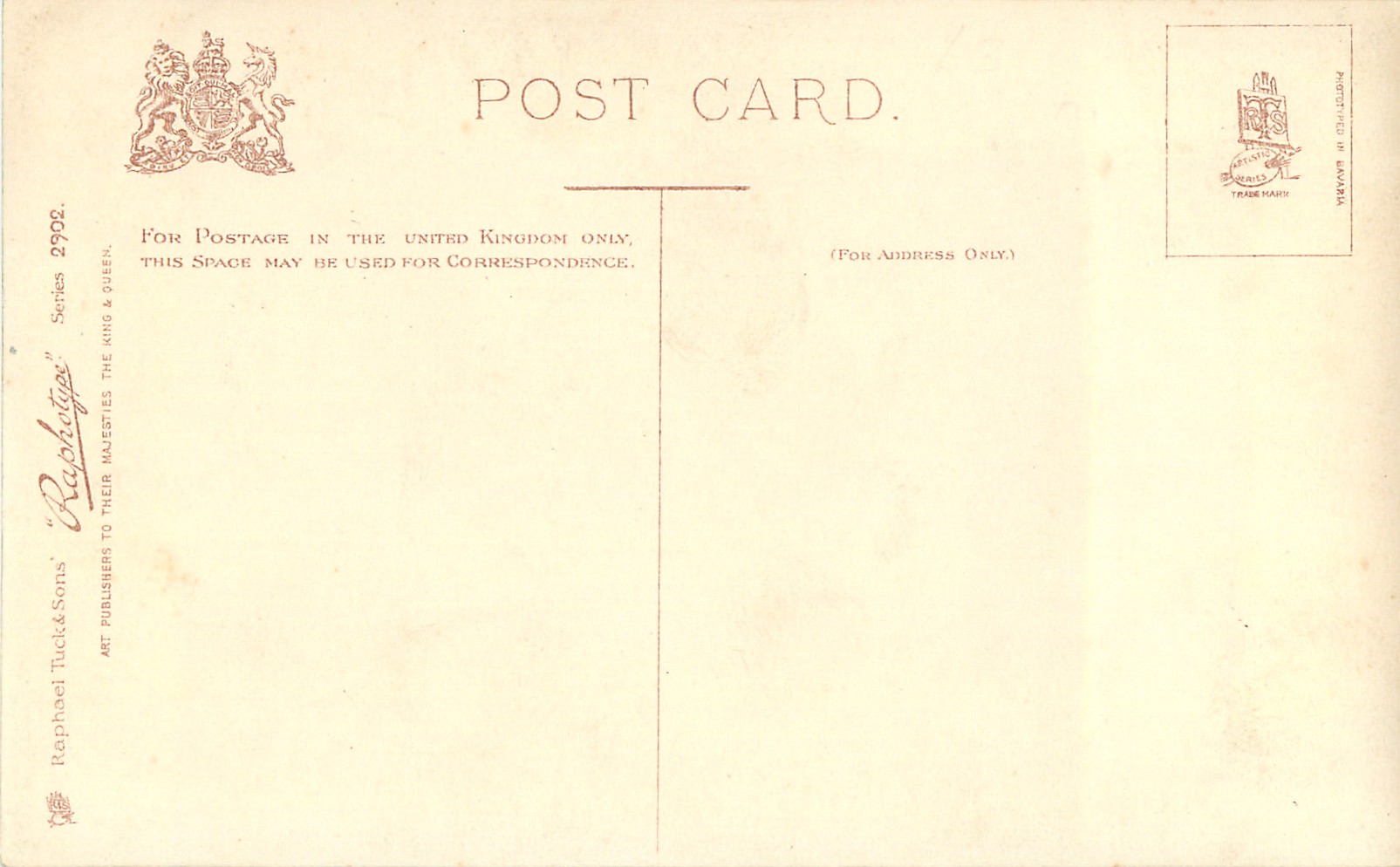 monochrome, RAPHOTYPE, PRODUCED IN BAVARIA, same images in sepia 2802, listed in 1904 POSTCARD Catalogue