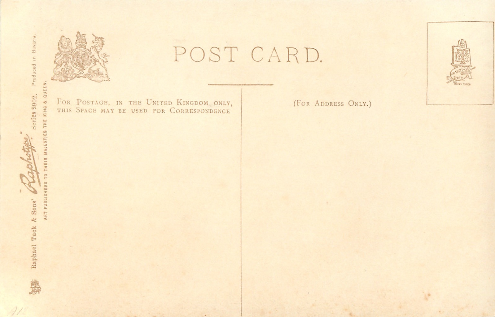 monochrome, RAPHOTYPE, PRODUCED IN BAVARIA, same images in sepia 2802, listed in 1904 POSTCARD Catalogue