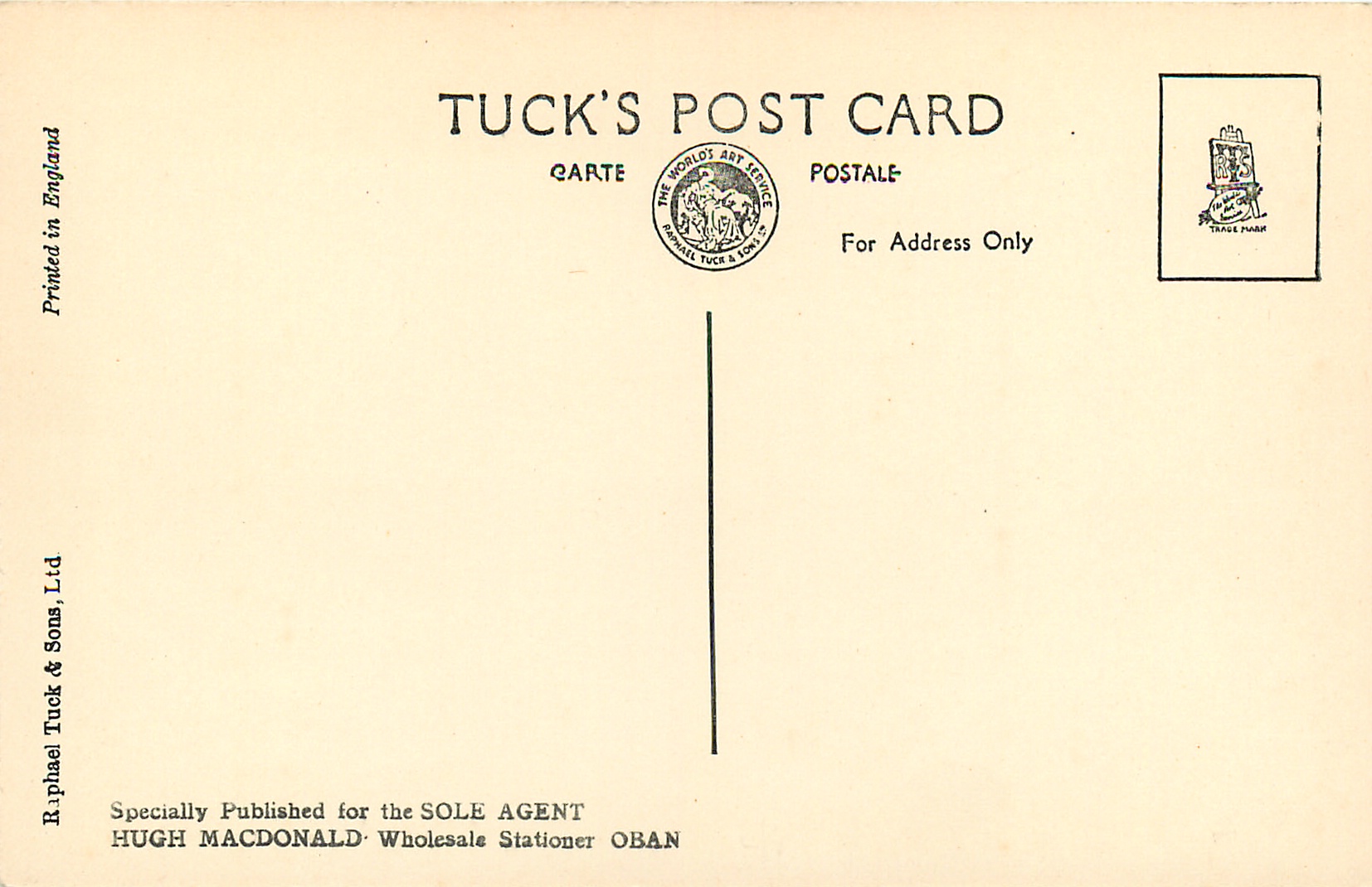 glossy sepia, PRINTED IN ENGLAND, SPECIALLY PUBLISHED FOR THE SOLE AGENT HUGH MACDONALD, WHOLESALE STATIONER OBAN.