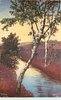 single birch trees on either side of stream right, bushes, stones in foreground, water behind, reddish sky behind