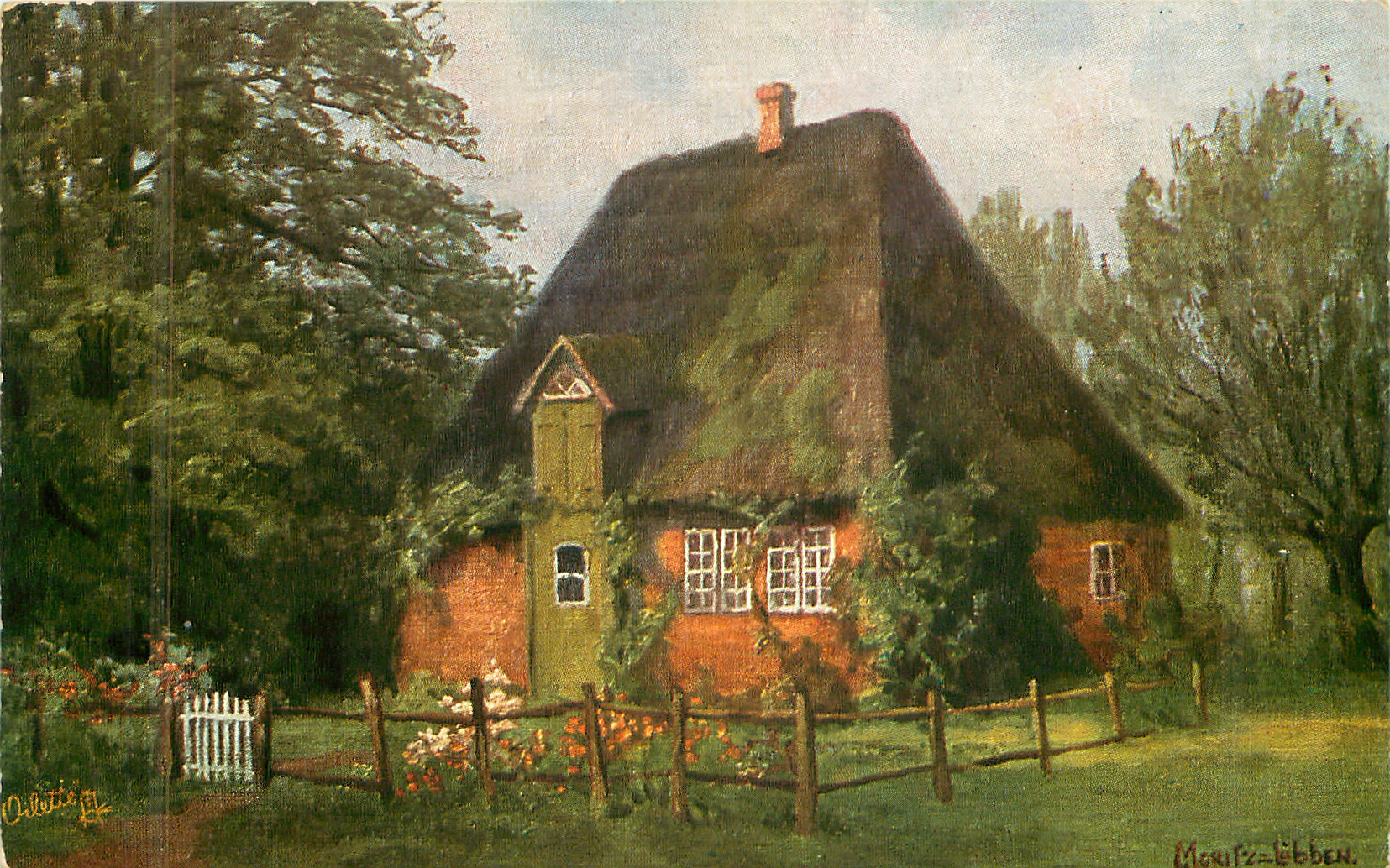 thatched cottage, one chimney, white gate in fence