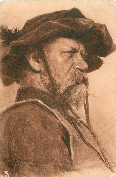 head & shoulders of man facing & looking right, hat with very long ribbons