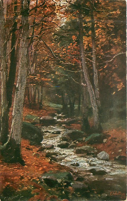 autumn woods scene, brook runs through trees, moss on rocks, brown fallen leaves