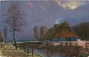 night scene, water extends back from right to left,two leafless trees left, barn right, moon partly behind heavy clouds