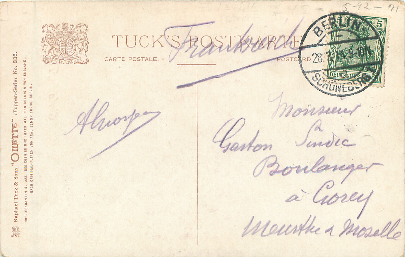 OILETTE, come with & w/o card titles in brown-red. NACH ORIGINAL-PUPPEN VON FRAU JENNY FUCHS, BERLIN.
