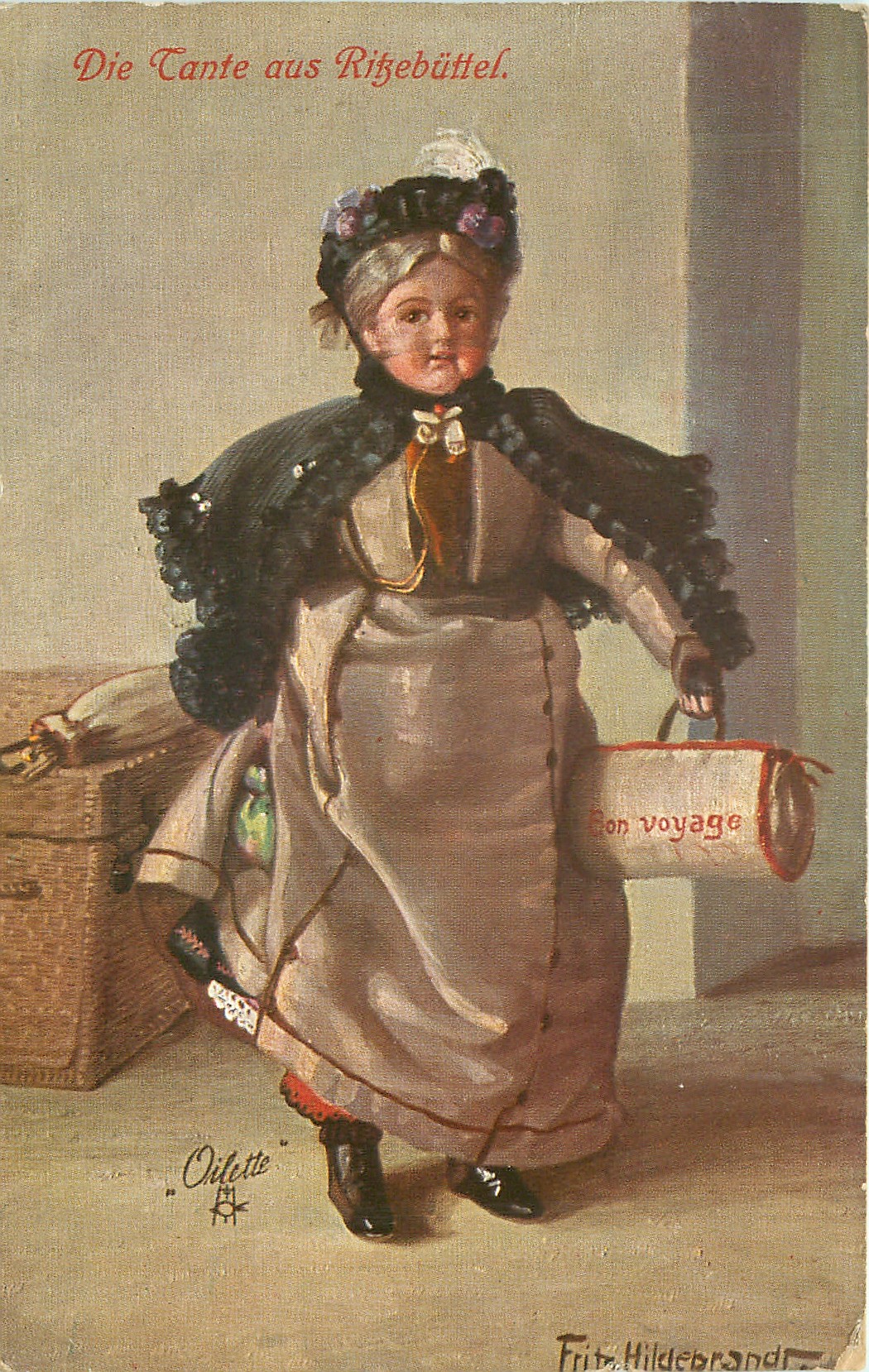 DIE TANTE AUS RITZEBUTTEL lady in brown dress carrying bag BON VOYAGE, trunk behind & left
