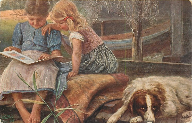 ES WAR.....MA EIN PTINZ two girls sit reading left, dog lies right, stares front