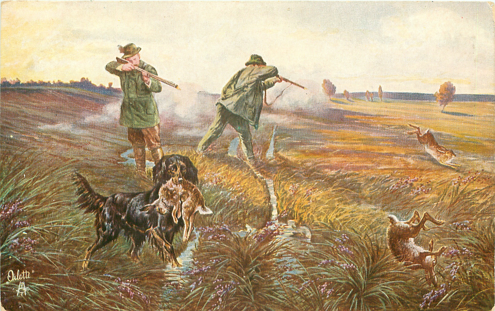 two men stand & shoot hares, retreiver left carries another
