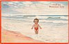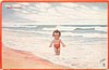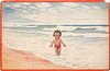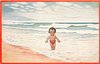 BADEMEISTER young girl with oustretched arms stands with back to sea