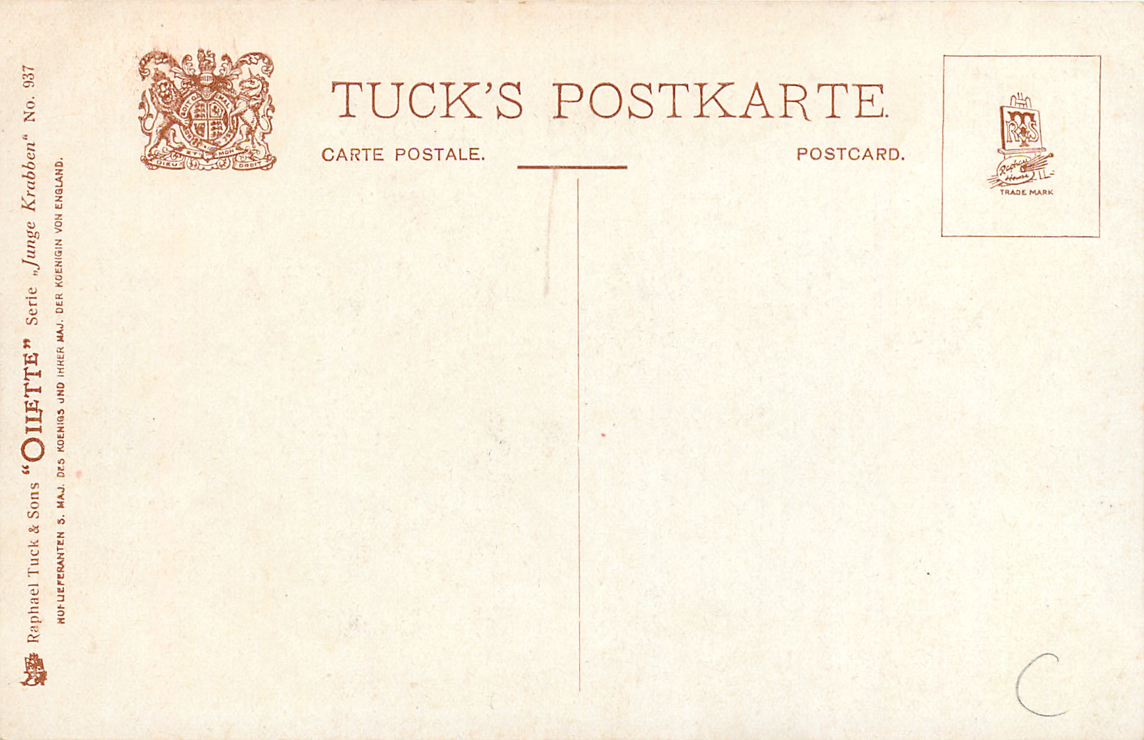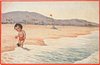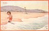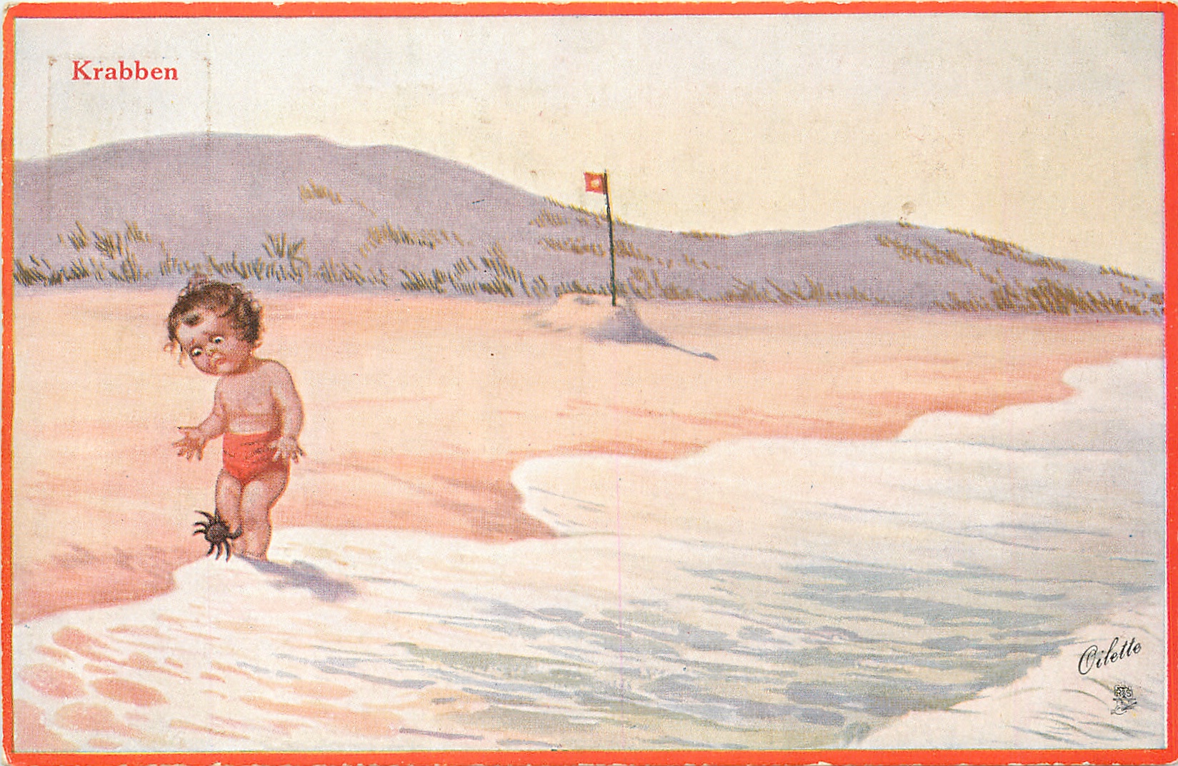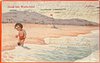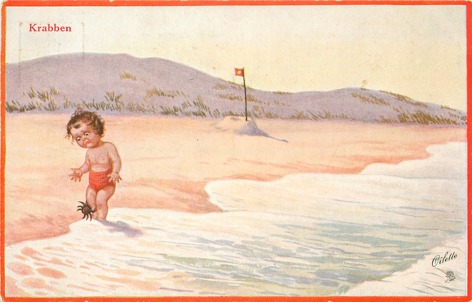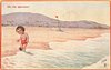 KRABBEN or OH, CHE SPAVENTO! or GRUSS AUS WESTERLAND young girl stands at edge of sea distressed by crab hanging on to her, flagged sandcastle behind
