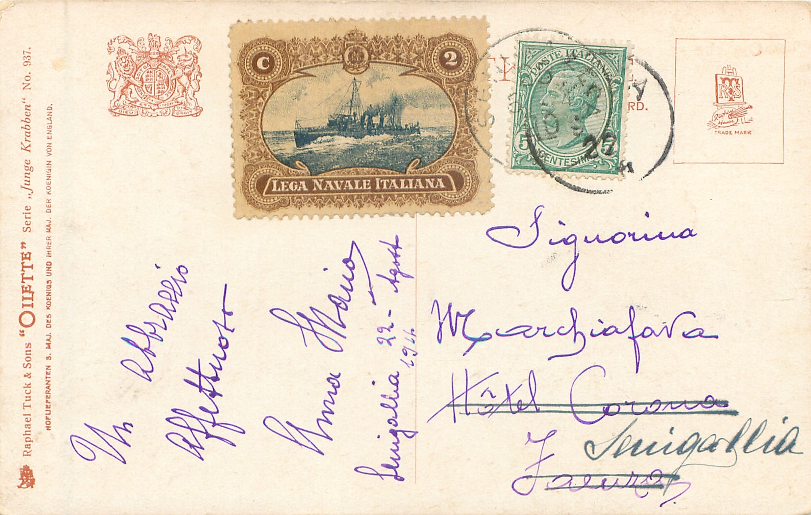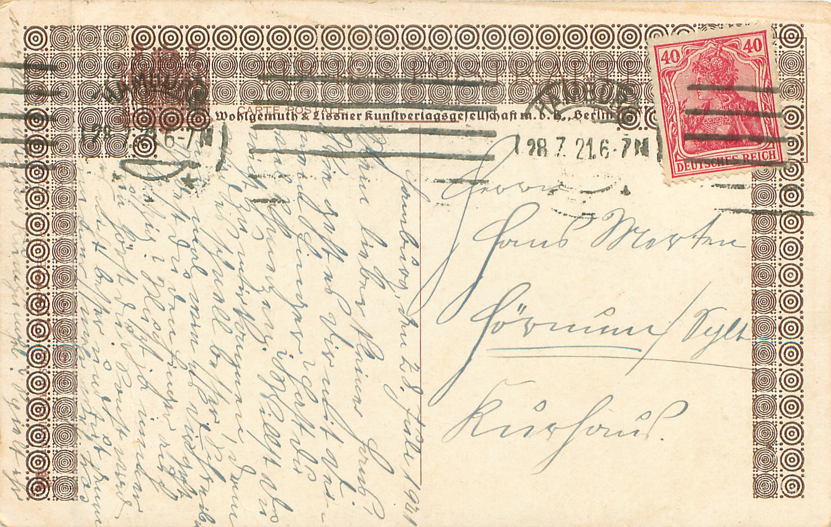 comes with all Tuck inscriptions & logo overprinted with purple ornamental design, used thus in Germany 28/07/1921