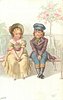 boy & girl sit on seat facing front, looking sideways at each other