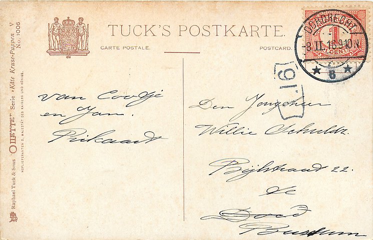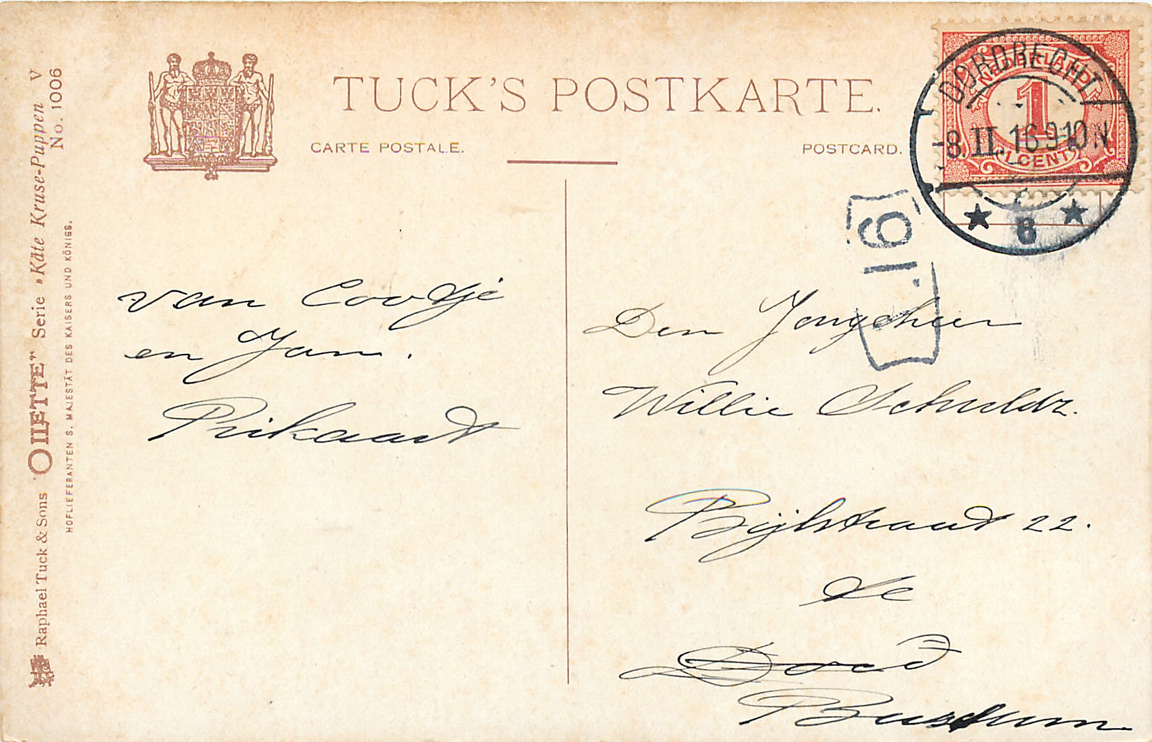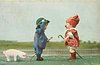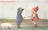 MELDE GEHORSAMST or untitled ----- boy doll left stands facing girl doll right, both have sticks between legs, white toy dog left