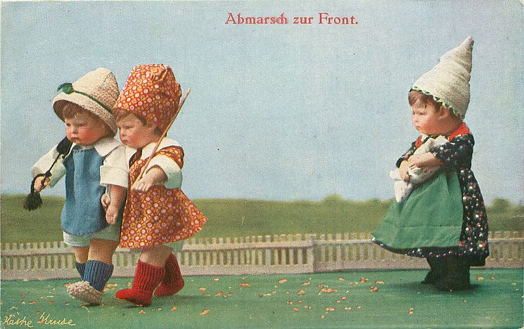 ABSMARSCH ZUR FRONT. boy & girl dolls march, another right watches them leave